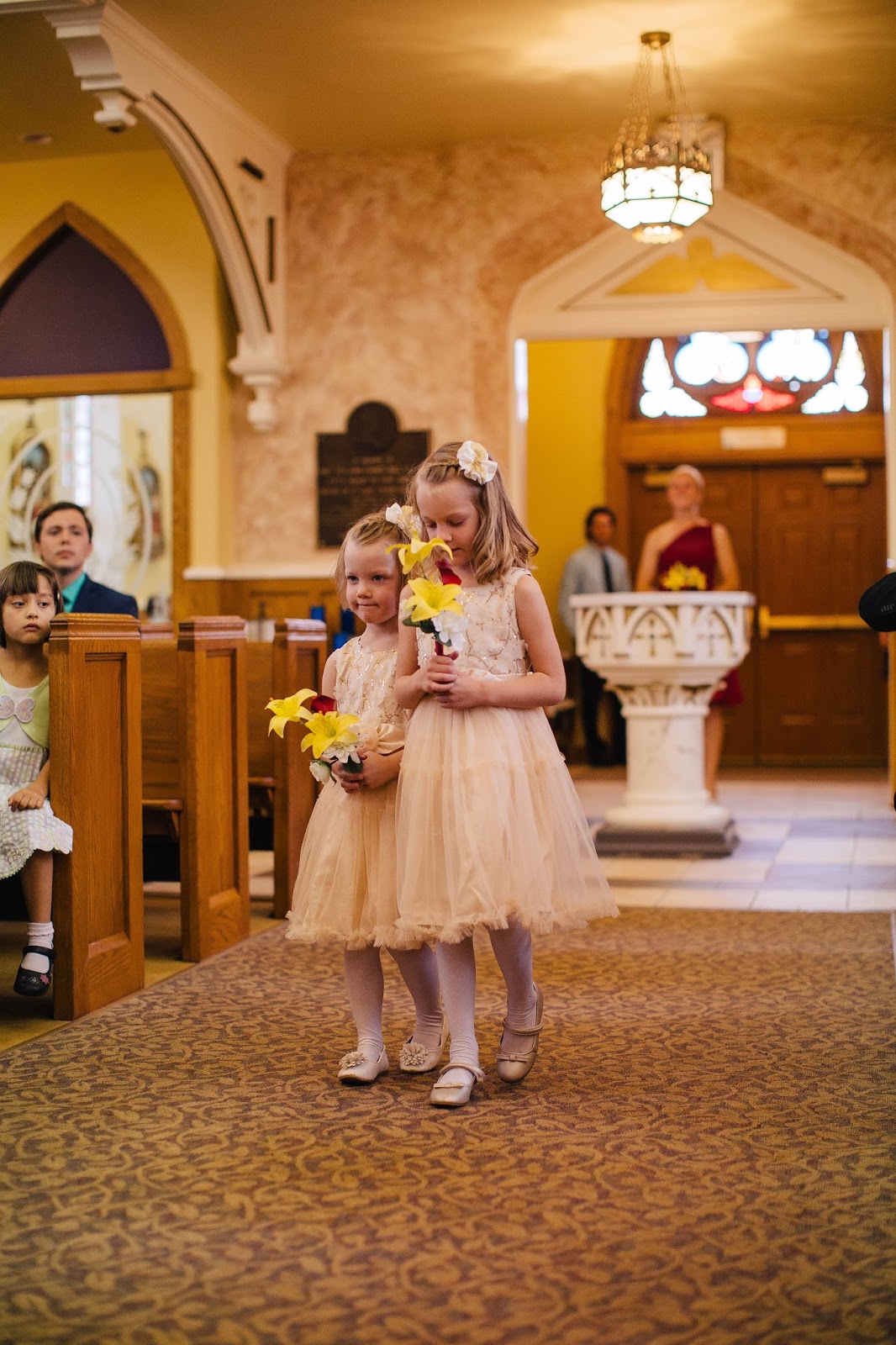 | Felicity changed her mind about walking up the aisle without Mommy, so all eyes on Miriam and Vivian! |